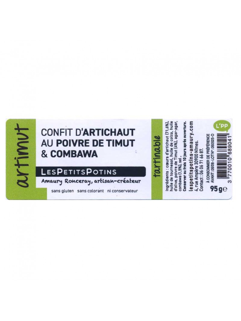 Ingrédients : fonds d’artichauts (71,6%), huile de tournesol, huile d’olive, poivre de Timut (4%), agar-agar, combawa (1,5%), sel.