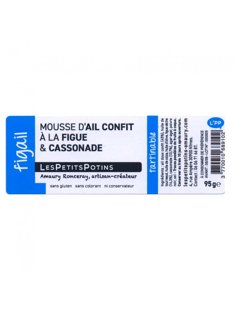 Ingrédients : ail doux confit (45%), huile de tournesol, huile d’olive, figue sèche (14,3%), cassonade (13,7%), agar-agar, sel.