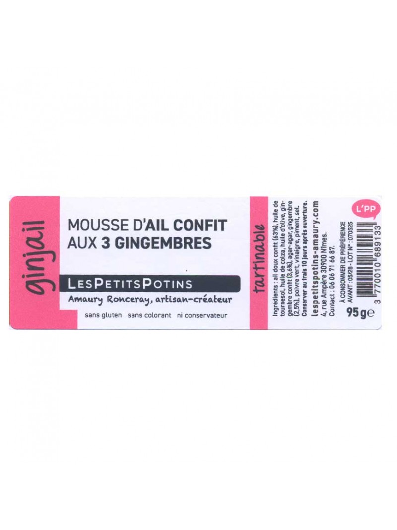 Ingrédients : ail doux confit (63%), huile de tournesol, huile d’olive, gingembre confit (3,6%), agar-agar, gingembre (2,5%),