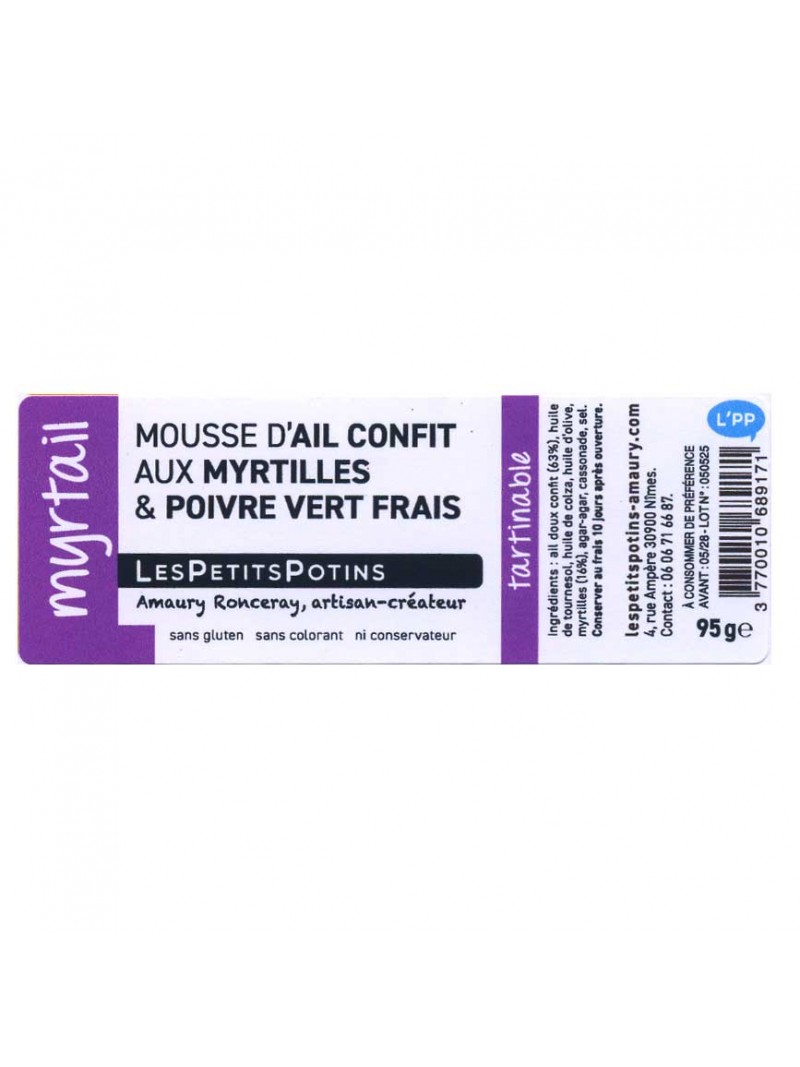 Ingrédients : ail doux confit (63%), huile de tournesol, huile d’olive, myrtilles (16%), agar-agar, cassonade, sel, poivre vert.