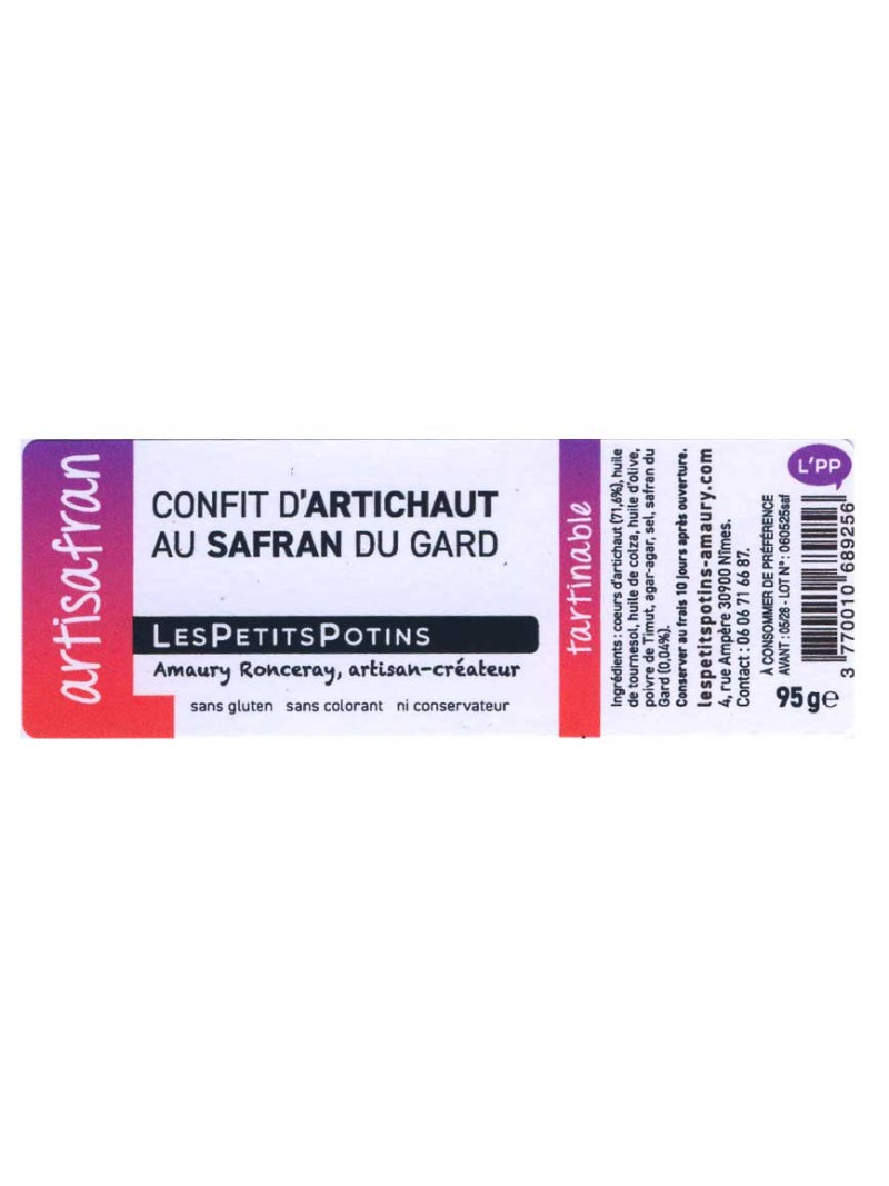 Ingrédients : fonds d’artichauts (71,6%), huile de tournesol, huile d’olive, poivre noir, agar-agar, sel, safran de Talaouine (0,04%).