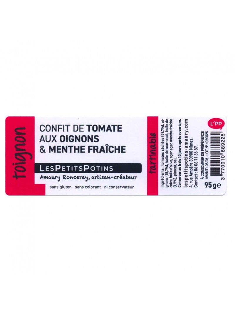 Ingrédients : huile de tournesol, tomates séchées (59,7%), oignons (18,7%), huile d’olive, agar-agar, menthe fraîche (1,5%), piment, sel.