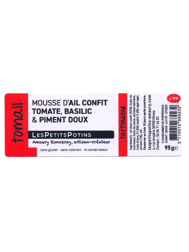Ingrédients : ail doux confit (52%), huile de tournesol, huile d’olive, tomates séchées (11,8%), basilic (1,6%), agar-agar, piment (1%), poivre, sel.